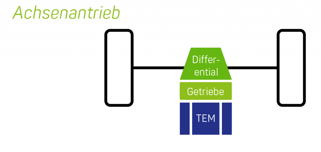 Bei Achsantrieben befinden sich die Elektromotoren in der Nähe oder auf der Achse des Fahrzeugs und übertragen direkt das Drehmoment auf die Räder. Diese Konfiguration erfordert oft weniger mechanische Komponenten im Vergleich zu Radantrieben und kann das Fahrzeugdesign vereinfachen. Achsantriebe werden oft in Elektrofahrzeugen eingesetzt und können sowohl für den Front- als auch für den Heckantrieb konfiguriert werden. Da die Traktionsmotoren meist hohe Drehzahlen erreichen (Obergrenzen liegen bei 15.000 U/min bis 20.000 U/min), müssen die Getriebe meist ein- oder zweistufig ausgelegt werden. Dies hängt wiederrum vom Anwendungsfall und dem vorliegenden Lastprofil ab, welches das benötigte Anfahrmoment und die maximale Endgeschwindigkeit als Auslegungskriterien mit sich bringt.