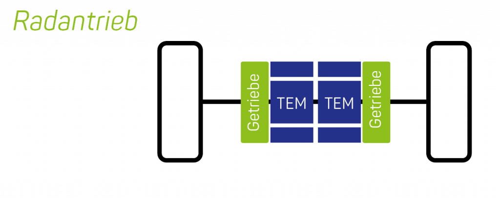 Radantriebe beziehen sich auf Antriebssysteme, bei denen die Antriebskraft über eine Antriebswelle auf die Räder übertragen wird. In der Regel befindet sich der Elektromotor in der Nähe des Räder. Dabei wird dieses direkt oder über eine Übersetzung angetrieben. Vorteilhaft sind dabei das Kurvenverhalten sowie die Möglichkeit, hochdrehende Motoren mit hoher Leistungsdichte zu integrieren.